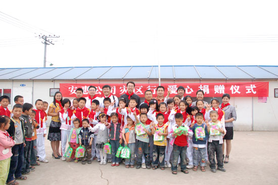 2009年5月12-13日,安惠公司舉行大地震周年系列紀念活動。副總經(jīng)理柯建民再赴德陽,給綿竹拱星小學(xué)孩子們送去“愛心包裹”。