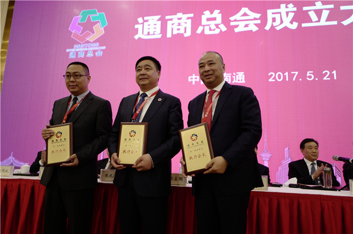 2017年5月21日下午,通商總會第一次會員代表大會隆重召開。會議通過了通商總會章程,選舉產(chǎn)生了通商總會執(zhí)行會長、副會長和理事。安惠公司董事長陳惠與其他兩人當(dāng)選為執(zhí)行會長,南通市委副書記、市政府市長韓立明為他們授牌。