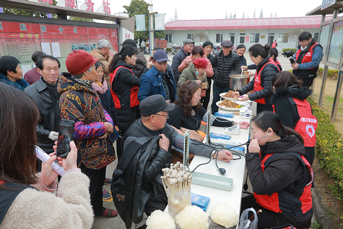 在闞家庵村活動中心,黨總支書記陳忠熱情地接待了安惠江海志愿者一行,并簡要介紹村情。縱有春寒料峭,也抵擋不住大家的熱情,學(xué)雷鋒活動吸引了眾多村民前來參加。安惠江海志愿者熱心地為村民們測量血壓,提供健康咨詢。安惠會議中心大廚精心準(zhǔn)備了美味的菌菇菜肴:黑椒汁杏鮑菇、糖醋木耳、蛋黃蟹味菇、南瓜茸銀耳,引得村民們連連豎起大拇指:“好吃好吃真好吃!”這些菌菇要怎么烹飪?里面加了什么材料?吃了對人體有什么好處?安惠江海志愿者詳細(xì)地為村民們一一解答,并為他們普及“一葷一素一菇”的健康飲食理念。